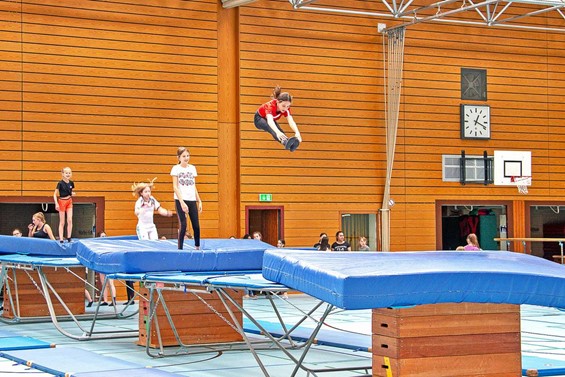 Trampolinturnen heißt Freude an der Bewegung und Förderung der eigenen motorischen und koordinatorischen Fertigkeiten. Bei dieser Sportart trainieren Schüler*innen zudem ihre Muskeln und stärken ihre Haltung und Bewegungssicherheit.Unter dem Motto „Nur Fliegen ist schöner!“ erlernen Schüler*innen grundlegende Kenntnisse im Trampolinspringen (kleines und großes Trampolin). Doch auch Sicherheit, Materialkunde und vor allem ganz viel Spaß stehen in dieser Arbeitsgemeinschaft im Mittelpunkt. Dabei wollen wir nicht nur Sport treiben und Spaß haben, sondern auch Auftritte – wie z.B. für den Tag der offenen Tür („Eröffnungsshow“) – vorbereiten.Voraussetzungen: Teilnahme in Sportkleidung und sauberen SockenZielsetzungen: Die Schüler*Innen sollten gegen Ende des Schulhalbjahres die Grundsprünge, mit oder ohne Salto, einschließlich kleinerer Übungen beherrschen.Inhalte: Auf- und Abbau der Trampoline, Hilfestellung an den Trampolinen, Erlernen der verschiedenen Grundsprünge, einschließlich des gehockten RückwärtssaltosKlassenstufen: alle JahrgängeAnsprechpartner: Herr Wiedenbrügge